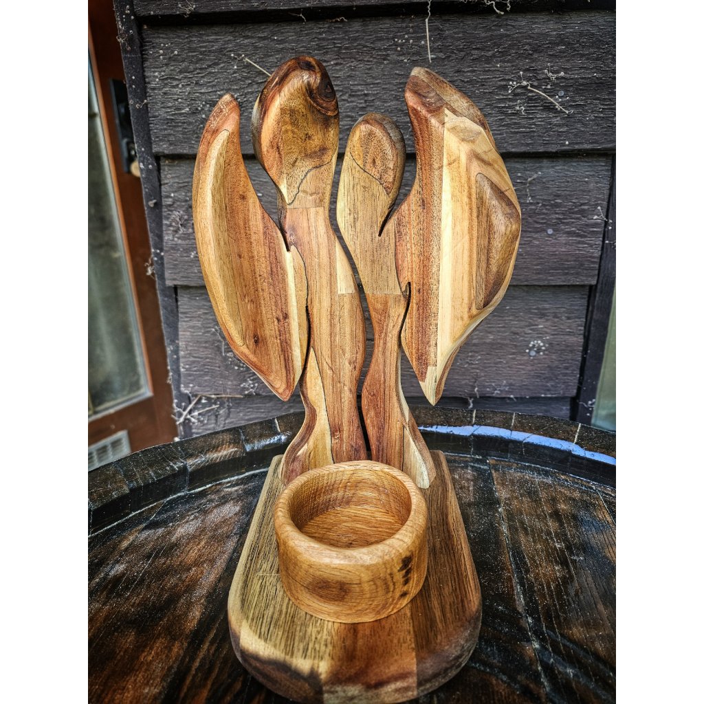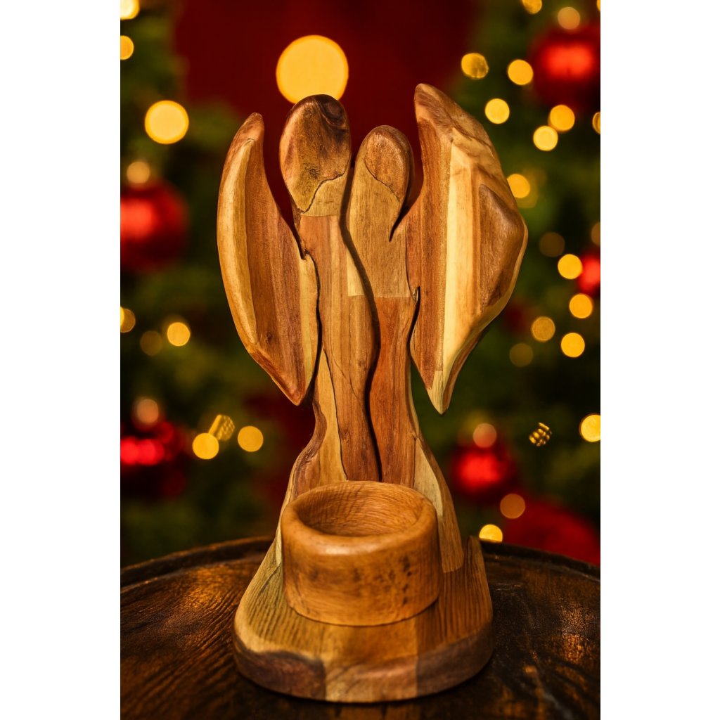 Dva andílci z akáciového dřeva s roztaženými křídly a odnímatelným kalíškem na svíčku. Materiál akácie